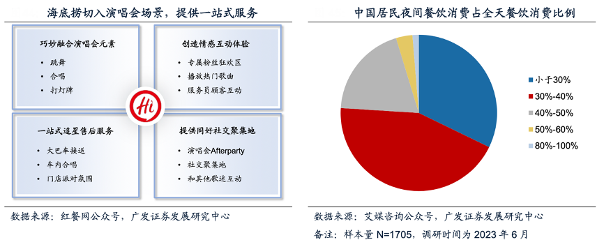經(jīng)典案例:根據(jù)紅餐網(wǎng)公眾號(hào)、艾媒咨詢公眾號(hào)、廣發(fā)證券發(fā)展研究中心等綜合資訊表明,2023年演唱會(huì)市場(chǎng)火熱,海底撈迅速抓住演唱會(huì)后打車難、夜宵少等痛點(diǎn),提供演唱會(huì)現(xiàn)場(chǎng)大巴車接送、車內(nèi)合唱、門店Afterparty等一 站式服務(wù),為消費(fèi)者提供情緒價(jià)值。