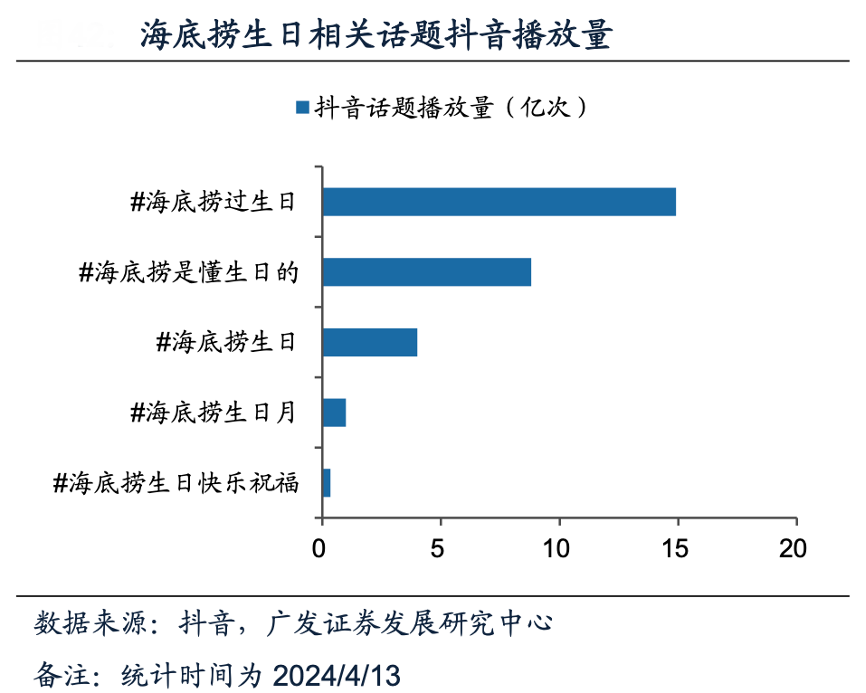 經典案例:根據(jù)抖音、廣發(fā)證券發(fā)展研究中心等綜合資訊表明,在海底撈過生日已成為別具特色的消費符號,在各社交平臺上具有較高熱度,屢屢出圈。截至2024年4月13日,抖音“海底撈過生日”話題播放量達14.9億次,“海底撈是懂生日的”話題播放量達8.8億次。