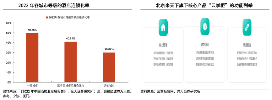 經(jīng)典案例:根據(jù)《2022年中國酒店業(yè)發(fā)展報(bào)告》、云掌柜官網(wǎng)、光大證券研究所等綜合資訊表明,2021、2022年,同程旅行先后收購了兩家 PMS(Property management system,酒店物業(yè)管理系統(tǒng))公司——長沙金天鵝(100%股權(quán)) 與北京米天下(53.5%股權(quán)),為低線城市的中小型酒店提供 SaaS 解決方案,協(xié)助其提高運(yùn)營效率。例如,米天下推出的云掌柜民宿多終端房態(tài)管理系統(tǒng)已服 務(wù) 20 萬家民宿,為其提供房態(tài)管理、財(cái)務(wù)統(tǒng)計(jì)、渠道直連等技術(shù)支持。