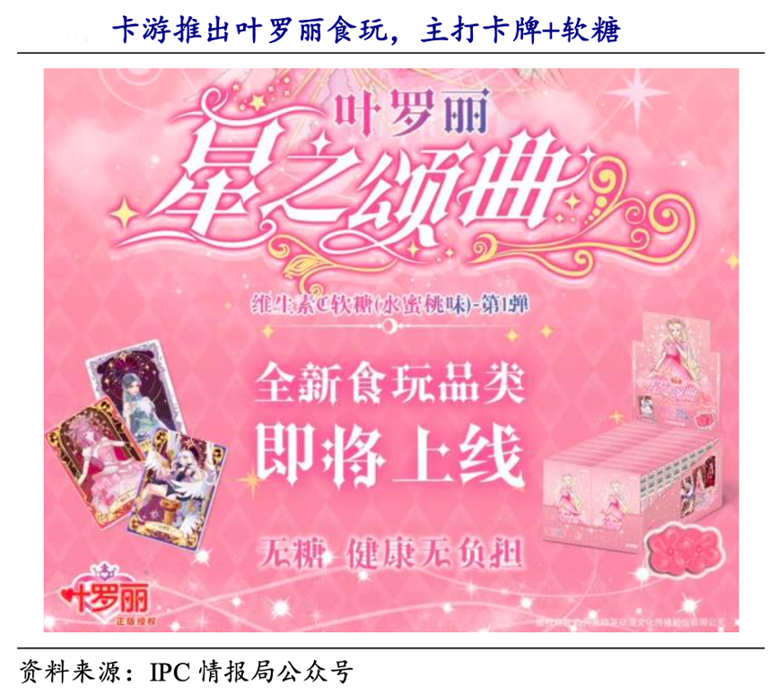 經(jīng)典案例:根據(jù)IPC情報(bào)局公眾號(hào)、開源證券研究所等綜合資訊表明,卡游在2024 年 7 月卡游向經(jīng)銷商發(fā)布了一則關(guān)于“將推出食玩類產(chǎn)品” 的公告,以提醒尚未有食品銷售資質(zhì)的經(jīng)銷商增加相關(guān)類目,從而更好地推進(jìn)商品銷售。首款食玩類產(chǎn)品“葉羅麗·星之頌曲·維生素 C 軟糖 (水蜜桃味)-第一彈”已上線。