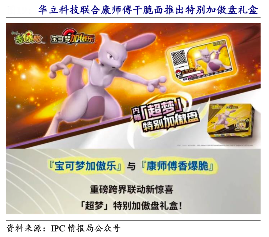 經(jīng)典案例:根據(jù)IPC情報(bào)局公眾號(hào)、開源證券研究所等綜合資訊表明,華立科技聯(lián)合康師傅干脆面推出特別加傲盤禮盒,包含香爆脆干脆面與一張?zhí)貏e加傲盤,加傲盤可用于在對(duì)應(yīng)游藝機(jī)進(jìn)行游玩或收藏。