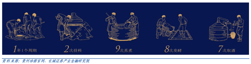 經(jīng)典案例:根據(jù)貴州珍酒官網(wǎng)、長城證券產(chǎn)業(yè)金融研究院等綜合資訊表明,在釀造工藝 方面,珍酒堅(jiān)守傳統(tǒng)大曲醬香釀造工藝和流程,約 11 個(gè)月一個(gè)周期,2 次投料,端午制曲,重陽下沙,9 次蒸煮,8 次發(fā)酵,7 次取酒,長期珍藏。一瓶珍酒的誕生,從釀造到 出廠銷售,至少要經(jīng)過 5 年以上時(shí)光與歲月的沉淀。