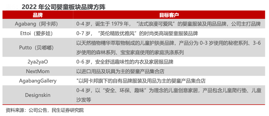 經(jīng)典案例:根據(jù)公司公告、民生證券研究院等綜合資訊表明,朗姿公司投資的韓國阿卡邦公司為韓國知名嬰童產(chǎn)品公司,旗下共有 10 多個(gè)系列品牌。愛多娃為公司國內(nèi)市場主推高端童裝品牌,2018 年至 2021 年?duì)I收增 速較快,由 1.30 億元增長至 2.84 億元,CAGR 達(dá) 29.76%。2022 年上半年嬰童 業(yè)務(wù)總營收 4.06 億,同比下降0.45%,主要受韓幣匯率變動(dòng)影響。