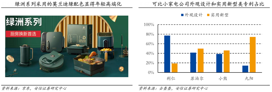 經(jīng)典案例:根據(jù)京東、企查查、安信證券研究中心等綜合資訊表明,利仁于 2019 年末推出了綠洲系列產(chǎn)品,產(chǎn)品包含電餅鐺、空氣炸鍋等多個(gè)廚電產(chǎn)品。系列產(chǎn)品不僅叫好也叫座,2019年該系列產(chǎn)品獲得“海峽杯工業(yè)設(shè)計(jì)(晉江)大賽”銀獎(jiǎng),系列中 G-3 型號(hào)的電餅鐺單品銷量已超 15 萬(wàn)臺(tái)。綠洲系產(chǎn)品的成功,主要來(lái)源于公司在外觀設(shè)計(jì)上的厚積薄發(fā)。公司的專利類別中 77%約為外觀設(shè)計(jì)專利,在主要小家電公司中占比最高。