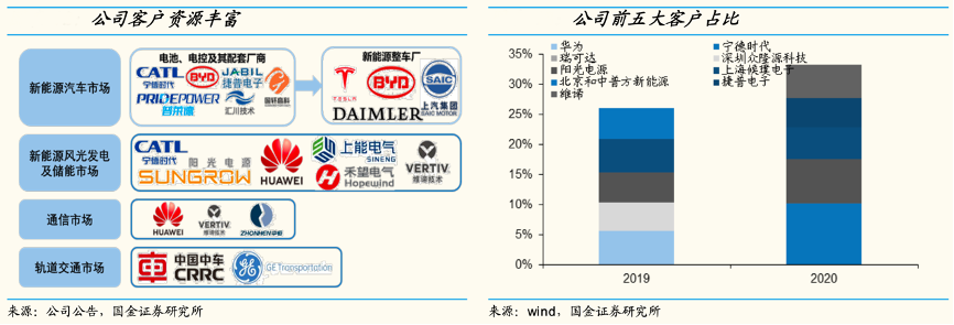 經(jīng)典案例:根據(jù)公司公告、wind、國金證券研究所等綜合資訊表明,憑借自身優(yōu)勢,中熔電氣公司在各個領(lǐng)域積累了優(yōu)質(zhì)客戶群。在新能源市場,公司熔斷器產(chǎn)品通過寧德時代、比亞迪供應(yīng)鏈、捷普電子等主流動力電池、電控系統(tǒng)及配套廠商切入新能源汽車供應(yīng)鏈,終端用戶有特斯拉、比亞迪、上汽乘用車等國內(nèi)外主流新能源整車廠。2020 年公司前五大客戶占比 33%,寧德時代、陽光電源分別為公司貢獻(xiàn)營收 0.23、0.17 億元,合計占據(jù)18%的份額。
