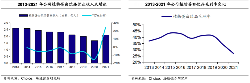 經(jīng)典案例:根據(jù)Choice、海通證券研究所等綜合資訊表明,祖名公司植物蛋白飲品主要包括自立袋豆奶、利樂包豆奶、瓶裝豆乳等,2017-2021 年公司植物蛋白飲品營業(yè)收入由 2.30 億元下降至 2.09 億 元(CAGR=-2.37%)。2022H1,植物蛋白飲品實現(xiàn)營收 0.90 億元(YOY= -8.56%)。 2021 年,公司推出了高膳食纖維且保質(zhì)期較長的“養(yǎng)自己”全豆豆乳系列,順應 低糖低脂、健康養(yǎng)生的飲品消費趨勢。