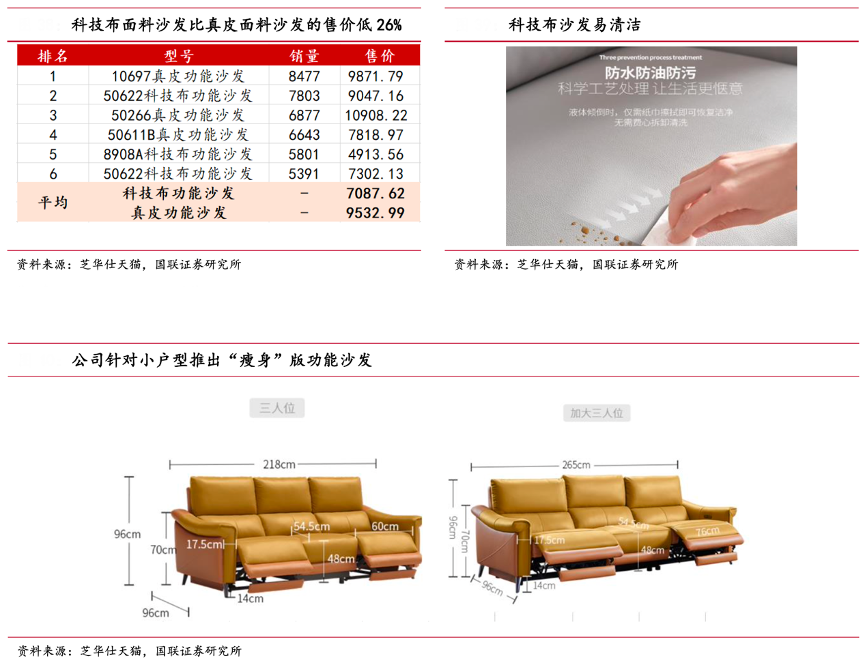 經(jīng)典案例:根據(jù)芝華仕天貓、國(guó)聯(lián)證券研究所等綜合資訊表明,敏華控股公司推出科技布功能沙發(fā)和小戶型功能沙發(fā),提高功能沙發(fā)滲透率。天貓旗艦店端統(tǒng)計(jì)的科技布沙發(fā)比真皮沙發(fā)價(jià)格低 26%左右。同時(shí)公司針對(duì)小戶型研發(fā)出適用性更強(qiáng)的“瘦身版”功能沙發(fā),由于使用的原料更少,價(jià)格也比同型號(hào)、同座數(shù)的中大戶型沙發(fā)低12.5%。