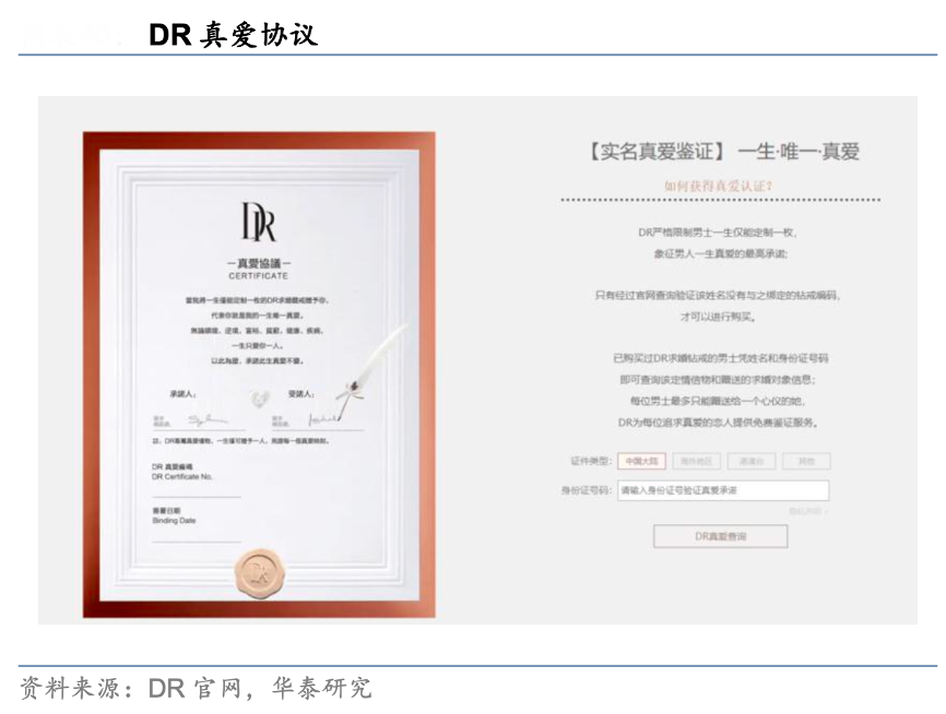 經典案例:根據各公司官網、華泰研究等綜合資訊表明,首次購買場景下,迪阿為保證品牌傳遞的“唯一”內涵,男士購買鉆戒系列產品時需綁定身份信息,并且只能贈予一人,通過真愛編碼等規(guī)則的限 制,顧客不能再次購買產品贈予另一人。復購場景下,求婚鉆戒不支持重復購買,僅可通過升級換款等方式對購買產品進行更新。