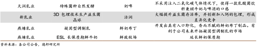 經(jīng)典案例:根據(jù)各公司公告、德邦研究所等綜合資訊表明,天潤(rùn)乳業(yè)運(yùn)用特殊菌種發(fā)酵技術(shù),生產(chǎn)出不注入二氧化碳?xì)怏w情況下,兼顧牛奶與啤酒口感的乳酸菌飲料奶啤,目前已成長(zhǎng)為貢獻(xiàn)公司超 10%收入的高毛利大單品。新乳業(yè)將 3D 包埋技術(shù)生產(chǎn)的益生菌晶球加入活潤(rùn)酸奶,大幅提升益生菌存活率,同時(shí)創(chuàng)新加入鈣的包埋,形成差異化競(jìng)爭(zhēng)。