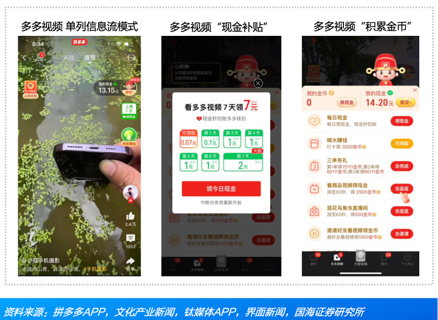經(jīng)典案例:根據(jù)拼多多APP、文化產(chǎn)業(yè)新聞、鈦媒體APP、界面新聞、國海證券研究所等綜合資訊表明,拼多多的多多視頻用戶激勵:1)用戶每天新點(diǎn)擊觀看視頻,都可直接收到轉(zhuǎn)賬到微信的現(xiàn)金,VIP待遇只限每天觀看的前10個視頻左右,且每次的收益約為一分錢;2)完成任務(wù)積累金幣可進(jìn)行單次體現(xiàn),積累金幣任務(wù)不限于瀏覽、搜索和下單。