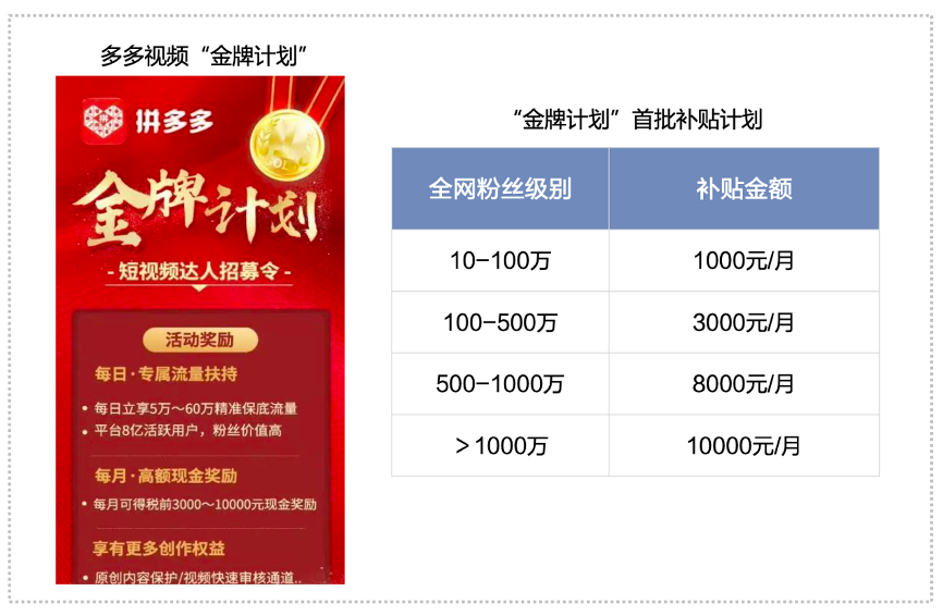 經(jīng)典案例:根據(jù)拼多多APP、文化產(chǎn)業(yè)新聞、鈦媒體APP、界面新聞、國海證券研究所等綜合資訊表明,拼多多的“多多視頻達(dá)人激勵”在于:1)推出“金牌計(jì)劃”:首批計(jì)劃規(guī)定全網(wǎng)粉絲在10-100萬的達(dá)人,每月補(bǔ)貼1000元;粉絲在100-500萬的達(dá)人,每月補(bǔ)貼3000元;500-1000萬,每月補(bǔ)貼8000元;1000萬粉絲以上,每月補(bǔ)貼10000元;2)發(fā)起“百萬傭金助力計(jì)劃”:在綁定多多進(jìn)寶的賬號中,選擇每周發(fā)布視頻并且成為“本周爆款”商品池中的 “獎“字商品,可以瓜分百萬傭金。