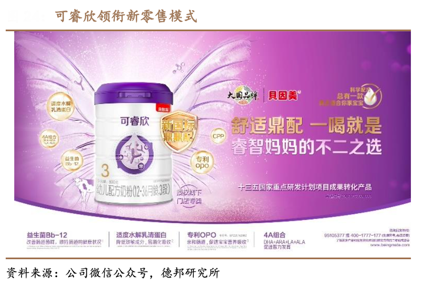 經(jīng)典案例:根據(jù)公司微信公眾號(hào)、德邦研究所等綜合資訊表明,貝因美2021 年度重點(diǎn)打造了“可睿欣”嬰幼兒配方乳粉,具有親舒腸道的功能,產(chǎn)品力強(qiáng),復(fù)購率高。該產(chǎn)品自上市以來便定位新零售模式。新零售模式通過實(shí)時(shí)跟蹤價(jià)值鏈各環(huán)節(jié)的數(shù)據(jù)信息和用戶信息,將前后臺(tái)數(shù)據(jù)打通融合,極大提高了整個(gè)價(jià)值鏈的運(yùn)行效率; 同時(shí)按照人、貨、場(chǎng)的概念,精準(zhǔn)匹配門店、商圈及目標(biāo)客戶,精細(xì)運(yùn)維賦能終端門店。截止2022 年 11 月,可睿欣已覆蓋超過 1 萬家門店。