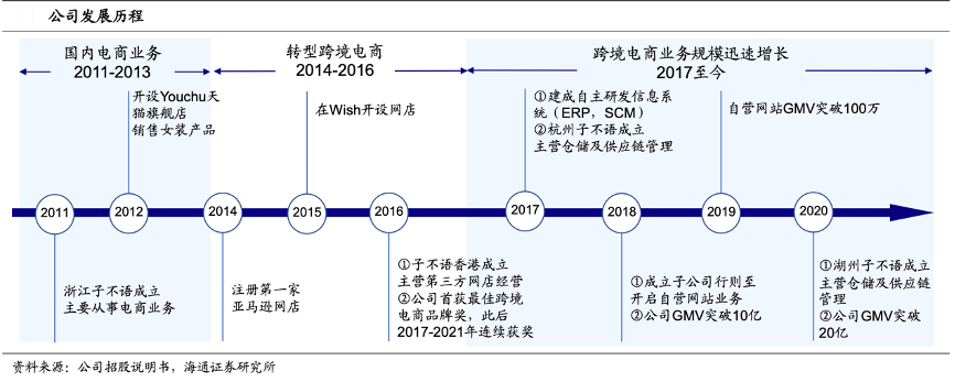 經(jīng)典案例:根據(jù)公司招股說明書、海通證券研究所等綜合資訊表明,2018年子不語公司成立自營網(wǎng)站,同年其所有銷售渠道 GMV 突破 10 億元,2020 年公司 GMV 超 20 億元,按于北美產(chǎn)生的 GMV 計(jì),在中國跨境 B2C 電商鞋服市場(chǎng)商家中排名第一。