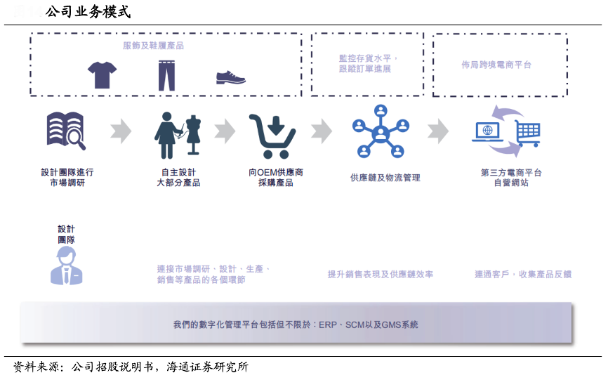 經(jīng)典案例:根據(jù)公司招股說(shuō)明書(shū)、海通證券研究所等綜合資訊表明,子不語(yǔ)公司致力于在全球范圍內(nèi)通過(guò)第三方渠道及自營(yíng)渠道銷(xiāo)售自主設(shè)計(jì)的服飾、鞋履及其他產(chǎn)品,業(yè)務(wù)流程主要包括產(chǎn)品自主設(shè)計(jì)、向 OEM 供應(yīng)商采購(gòu)商品、通過(guò)專(zhuān)用數(shù)字化系統(tǒng)進(jìn)行供應(yīng)鏈及物流管理、通過(guò)第三方平臺(tái)及自營(yíng)網(wǎng)站進(jìn)行商品銷(xiāo)售及服務(wù)。