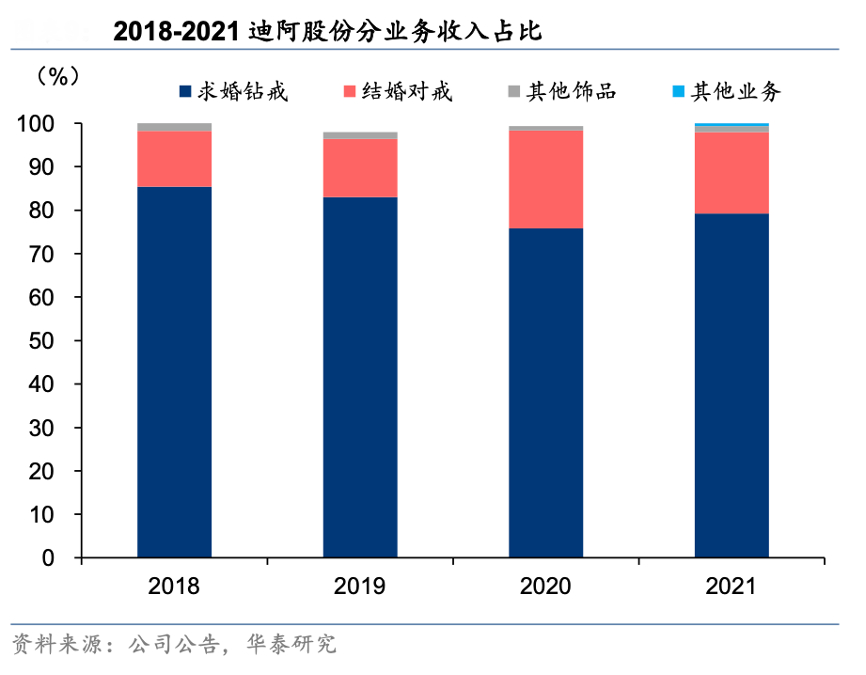 經(jīng)典案例:根據(jù)公司公告、華泰研究等綜合資訊表明,分產(chǎn)品看,迪阿公司“求婚鉆戒+結(jié)婚對(duì)戒”產(chǎn)品營(yíng)收占比超九成。其品牌以“一生唯一真愛”為 主要宣傳著力點(diǎn),主打求婚鉆戒一生只能定制一枚(升級(jí)換款除外)。求婚鉆戒營(yíng)收占比高,2021年占營(yíng)收 79.2%;結(jié)婚對(duì)戒次之,2021年?duì)I收占比 18.7%。