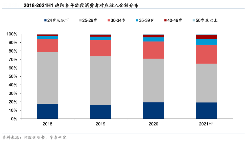 經(jīng)典案例:根據(jù)招股說明書、華泰研究等綜合資訊表明,迪阿公司的主力消費(fèi)者為 29 歲及以下的年輕消費(fèi)群體,社媒、電商、短視頻等營(yíng)銷方式也使得 DR 實(shí)現(xiàn)與年輕人同頻共振并獲得眾多年輕群體的消費(fèi)青睞。同時(shí),品牌力的泛化也讓越來越多的非婚慶消費(fèi)群體選擇購(gòu)買 DR 表達(dá)愛意。2021H1,34歲及以下消費(fèi)者銷售額占公司銷售總額 87.2%,適婚人群仍為主力消費(fèi)者;同時(shí),35歲以上消費(fèi)者占比逐步提升,印證了 DR 在非婚慶場(chǎng)景的品牌影響力。