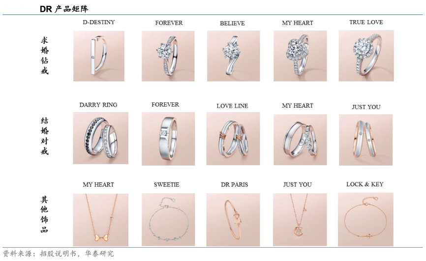 經(jīng)典案例:根據(jù)招股說明書、華泰研究等綜合資訊表明,迪阿公司打造了豐富的產(chǎn)品矩陣,截至 2021 年底,其共推出求婚鉆戒 70 余款、結(jié)婚對(duì)戒 170 余款以及其他飾品 200 余款。婚戒主打系列包括 FOREVER 系列簡(jiǎn)奢款、FOREVER 系列經(jīng)典款、MY HEART 簡(jiǎn)奢款、TURE LOVE 典雅款。