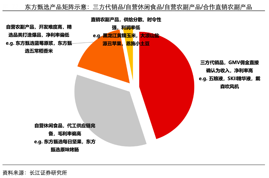經典案例:根據(jù)長江證券研究所等綜合資訊表明,東方甄選構建了系列產品矩陣,打破傳統(tǒng)品類運行的機制,推動三方代銷品、自營休閑食品、自營農副產品等多樣化產品的戰(zhàn)略協(xié)同。