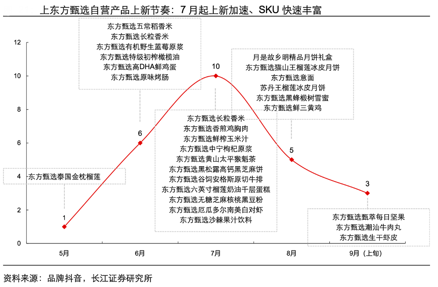 經典案例:根據(jù)品牌抖音、長江證券研究所等綜合資訊表明,東方甄選自營產品快速上新,品類明顯豐富,根據(jù)不完全統(tǒng)計,自營 SKU5 月~9 月上新數(shù)分別為 1、 6、10、6、20 款,速度明顯加快;品類選擇有所鋪開,不僅是農副產品、更增加了多款 產業(yè)鏈更成熟、盈利能力更穩(wěn)定的零食飲品,迅速構筑起東方甄選新模式的盈利核心。