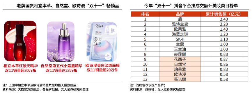 優(yōu)秀案例:根據(jù)天貓官方旗艦店、商指針、各品牌戰(zhàn)報(bào)、光大證券研究所等綜合資訊表明,部分老牌國(guó)貨通過(guò)聯(lián)合超頭主播實(shí)現(xiàn)單品打爆、使品牌再次出 圈,如“雙十一”期間,相宜本草天貓旗艦店 GMV 突破 2 億元、同比增長(zhǎng) 超 88%,旗下紅景天系列煥白精華液銷量超 30 萬(wàn)瓶、龍膽系列凍干精華面膜銷 量超 319 萬(wàn)盒;自然堂第五代小紫瓶精華累計(jì)售出 23 萬(wàn)瓶;歐詩(shī)漫美白淡斑面 膜銷量超 20 萬(wàn)件。