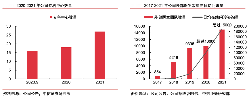 經(jīng)典案例:根據(jù)公司公告、公司招股說(shuō)明書(shū)、中信證券研究部等綜合資訊表明,京東健康公司近年來(lái)成立了包括心臟中心、耳鼻喉中心、感染及肝病中心、腦營(yíng)養(yǎng)中心等多個(gè)??浦行?,截至 2021 年底共擁有 27 個(gè)??浦行模税儆辔粚<液晚敿?jí)名醫(yī)加入。同時(shí),公司通過(guò)??浦行倪B接更多的外部?jī)?yōu)質(zhì)醫(yī)療資源,外部醫(yī)生團(tuán)隊(duì)覆蓋超過(guò) 15000 家醫(yī)院。2022H1,公司推出專家在線、秒問(wèn)京醫(yī)、夜間急診三項(xiàng)問(wèn)診服務(wù),日均在線問(wèn)診咨詢量超過(guò) 25 萬(wàn)次。