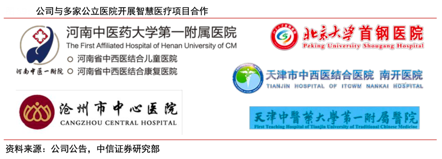 經(jīng)典案例:根據(jù)公司公告、中信證券研究部等綜合資訊表明,京東健康公司近年來(lái)加速布局智慧醫(yī)療領(lǐng)域,其已與多家醫(yī)院展開(kāi)合作:2020 年與天津市南開(kāi)醫(yī)院合作搭建南開(kāi)京東互聯(lián)網(wǎng)醫(yī)院,實(shí)現(xiàn)包括在線復(fù)診、健康咨詢等一體化服務(wù);2021年與河南中醫(yī)藥大學(xué)第一附屬醫(yī)院共建互聯(lián)網(wǎng)醫(yī)院,年底累計(jì)注冊(cè)患者人數(shù)接近 15 萬(wàn);此外,公司還與首都醫(yī)科大學(xué)附屬北京地壇醫(yī)院達(dá)成戰(zhàn)略合作,幫助建立互聯(lián)網(wǎng)醫(yī)院。