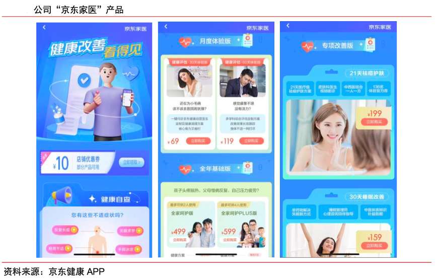 經(jīng)典案例:根據(jù)京東健康APP、中信證券研究部等綜合資訊表明,京東家醫(yī)是一項套餐服務,包括專職家庭醫(yī)生、專家問診、醫(yī)生轉診、電話家醫(yī)、多人視頻問診等多種服務功能,2022H1,京東家醫(yī)升級服務模式,引入中醫(yī)、營養(yǎng)師、心理咨詢師等專業(yè)的健康管理師角色,提供更全面的健康管理服務。
