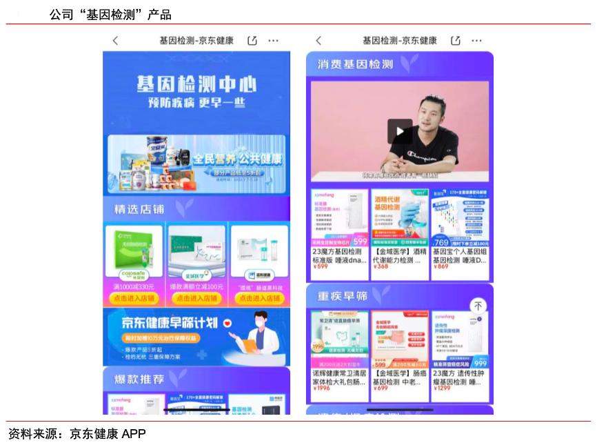 經(jīng)典案例:根據(jù)京東健康APP、中信證券研究部等綜合資訊表明,京東健康公司通過與第三方合作,提供健康體檢、基因檢測、醫(yī)療美容、口腔齒科、疫苗孕產(chǎn)、眼科服務等多類健康服務。2022H1,京東健康進一步完善重疾早篩服務能力,并推出相關保險服務。目前,有超過 1000 家服務商家入駐京東健康平臺,覆蓋全國范圍內超過 500 個地市的 4 萬家線下門店。