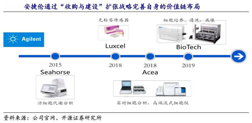經(jīng)典案例:根據(jù)公司官網(wǎng)、開源證券研究所等綜合資訊表明,安捷倫通過“收購與建設(shè)”的發(fā)展戰(zhàn)略,不斷完善自身的價值鏈布局、提升自己的全球影響力。2010年,安捷倫收購儀器制造公司 Varian, 增強了自身在化學分析儀器方面的業(yè)務深度,并正式進入生命科學領(lǐng)域,并通過對其核磁共振業(yè)務的整合成為全球三大核磁供應商。