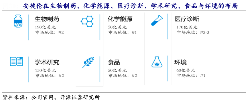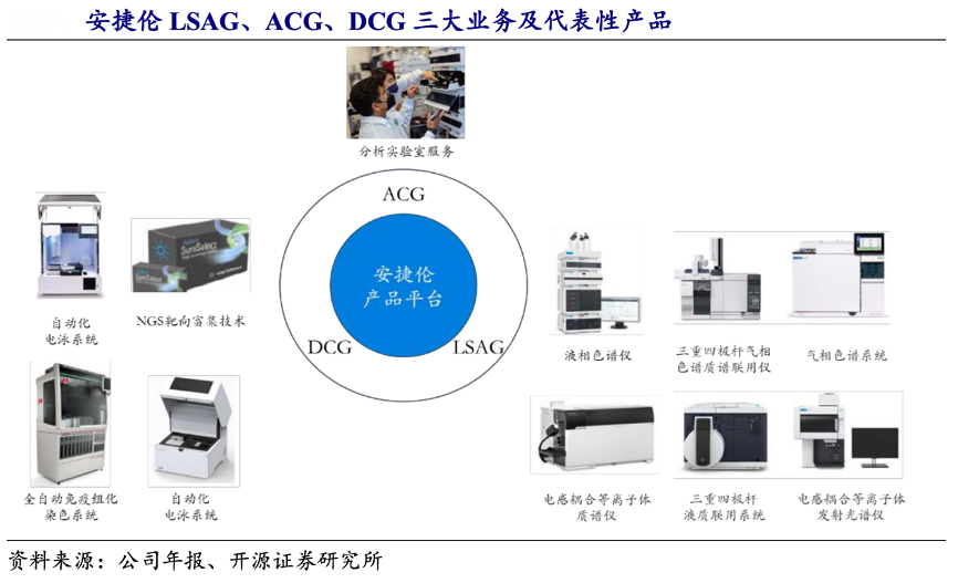 經(jīng)典案例:根據(jù)公司年報(bào)、開源證券研究所等綜合資訊表明,安捷倫(Agilent)是全球生命科學(xué)、醫(yī)療診斷和應(yīng)用化學(xué)市場(chǎng)的龍頭企業(yè),主要包括生命科學(xué)應(yīng)用(LSAG)、交叉實(shí)驗(yàn)室(ACG)、診斷學(xué)和基因?qū)W(DGG)三 大業(yè)務(wù)集團(tuán),面向食品、環(huán)境、醫(yī)藥、診斷、化學(xué)能源、科學(xué)研究六大板塊提供先進(jìn)的儀器、軟件、耗材和服務(wù),包括毛細(xì)管電泳儀、色譜儀、光譜儀、質(zhì)譜儀、臨 床流式細(xì)胞儀、微陣列掃描儀以及觀測(cè)、染色、過(guò)濾相關(guān)的儀器。