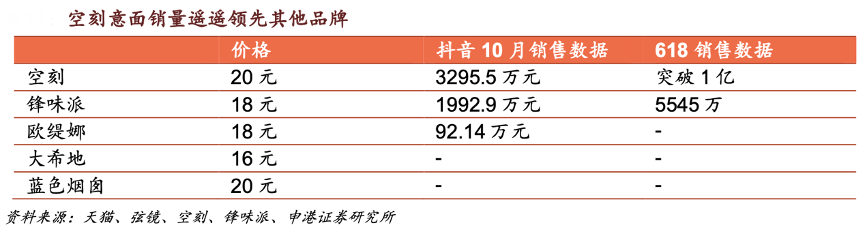 經(jīng)典案例:根據(jù)天貓、弦鏡、空刻、鋒味派、申港證券研究所等綜合資訊表明,空刻于 2019 年 5 月推出速食意面,通過打造“空刻=意大利正宗意面”概念占領(lǐng)消費(fèi)者心智,后鋒味派、歐緹娜、大 希地、藍(lán)色煙囪等相繼推出速食意面,但空刻意面銷量仍遙遙領(lǐng)先。2022 年 5 月 空刻總銷售額破億,618 大促期間全渠道銷售額破億。