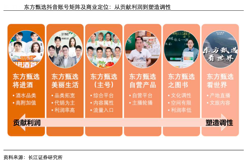 經(jīng)典案例:根據(jù)長江證券研究所等綜合資訊表明,“東方甄選”品牌目前下設 7 個抖音直播間,組合構成公司戰(zhàn)略的目標利潤率與調性風格平衡。大體來說,貢獻利潤的是將進酒、美麗生活兩個賬號,代銷傭金將直接確認為收入;塑造調性的是看世界、圖書兩個賬號,執(zhí)行創(chuàng)始人推崇的“讀萬卷書,行千里路” 理念,但品類天花板與利潤率水平相對低;主號享受最大的流量基礎,作為綜合平臺兼 顧商業(yè)與文化雙重屬性,為其他矩陣號宣傳引流。