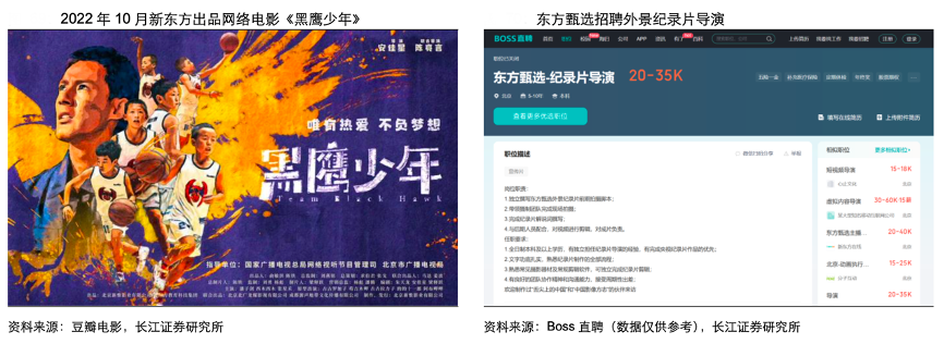 經(jīng)典案例:根據(jù)豆瓣電影、Boss直聘、長江證券研究所等綜合資訊表明,除了直播間中一系列嘉賓做客、外景直播內容,新東方集團已作為出品人于2022年 10 月全網(wǎng)上線電影《黑鷹少年》,并通過 11 月新開的“東方甄選看世界”抖音號持續(xù)創(chuàng)作人文旅游內容。