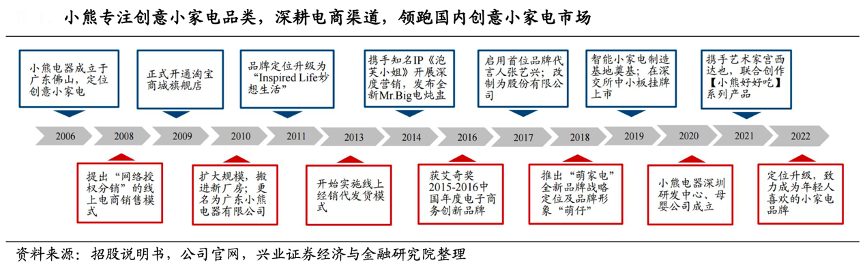 經(jīng)典案例:根據(jù)招股說(shuō)明書(shū)、公司官網(wǎng)、興業(yè)證券經(jīng)濟(jì)與金融研究院等綜合資訊表明,小熊電器 2006 年成立于廣東佛山,多年來(lái)專注于創(chuàng)意小家電研發(fā)、設(shè)計(jì)、生產(chǎn)和銷售。其以酸奶機(jī)等長(zhǎng)尾品類起家,把握電商時(shí)代紅利,完善線上渠道布局,打造高性價(jià)比、時(shí)尚年輕的品牌形象,成為國(guó)內(nèi)領(lǐng)先的創(chuàng)意小家電龍頭。