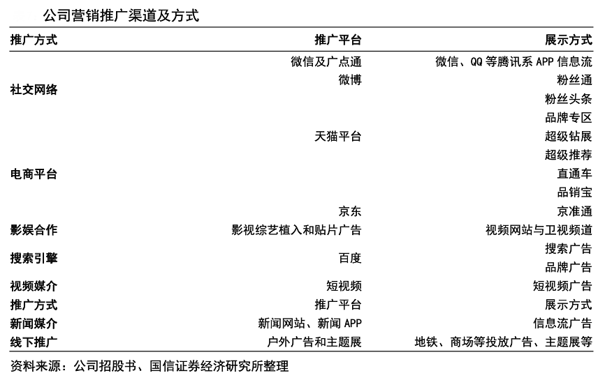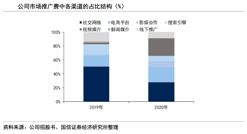 經(jīng)典案例:根據(jù)公司招股書(shū)、國(guó)信證券經(jīng)濟(jì)研究所等綜合資訊表明,迪阿股份公司積極把握短視頻風(fēng)口,加大了在抖音、快手等短視頻渠道的投入,2020 年視頻媒介推廣費(fèi)投入大幅增長(zhǎng) 990.53%,投入占比從 2019 年的僅2.29%大幅提升至 25.16%。