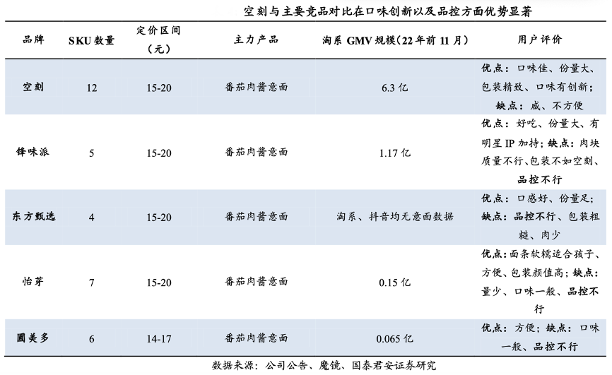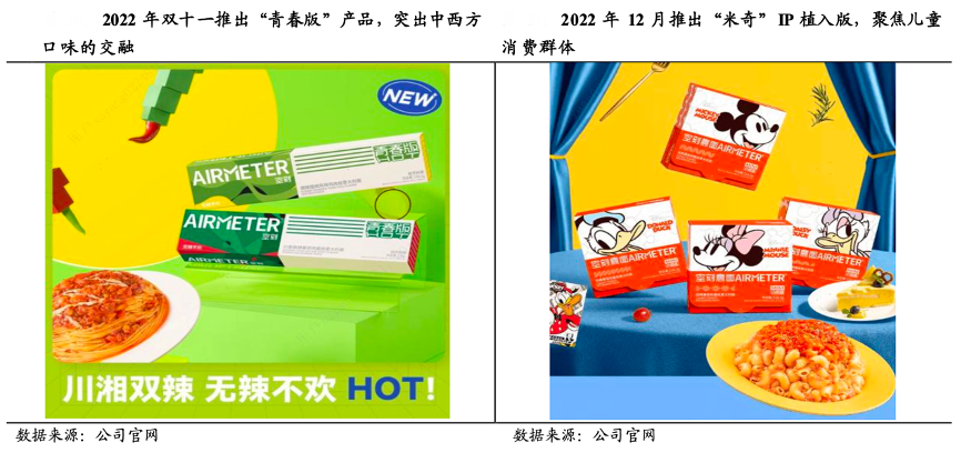經(jīng)典案例:根據(jù)公司官網(wǎng)、國(guó)泰君安證券研究等綜合資訊表明,聚焦意面,空刻公司持續(xù)補(bǔ)齊自身產(chǎn)品矩陣,一方面持續(xù)發(fā)揚(yáng)寶立的優(yōu)勢(shì),不斷推出中西方口味混合的產(chǎn)品,另一方面聚焦兒童消費(fèi)群體,持續(xù)在 IP 植入以及面型創(chuàng)新方面發(fā)力。