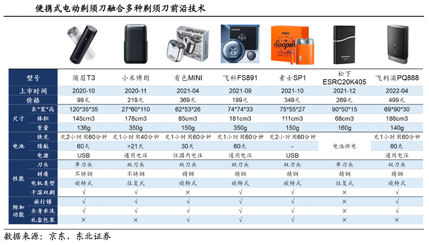 經(jīng)典創(chuàng)新案例:根據(jù)京東、東北證券等綜合資訊表明,電動剃須刀的常規(guī)升級包括干濕雙剃、旋轉(zhuǎn)式電機、多刀頭等,而便攜式在兼容常規(guī)升級后,進一步在外觀上開拓 出圓柱形、方形、飛碟形等不同結(jié)構(gòu),其輕巧的體積和新穎的外形使其在中低價格 帶更加流行。根據(jù)奧維云網(wǎng)數(shù)據(jù)推算,2022 年 6 月便攜式剃須刀線上均價較 2021 年 1 月時提升約 36%至 145 元。