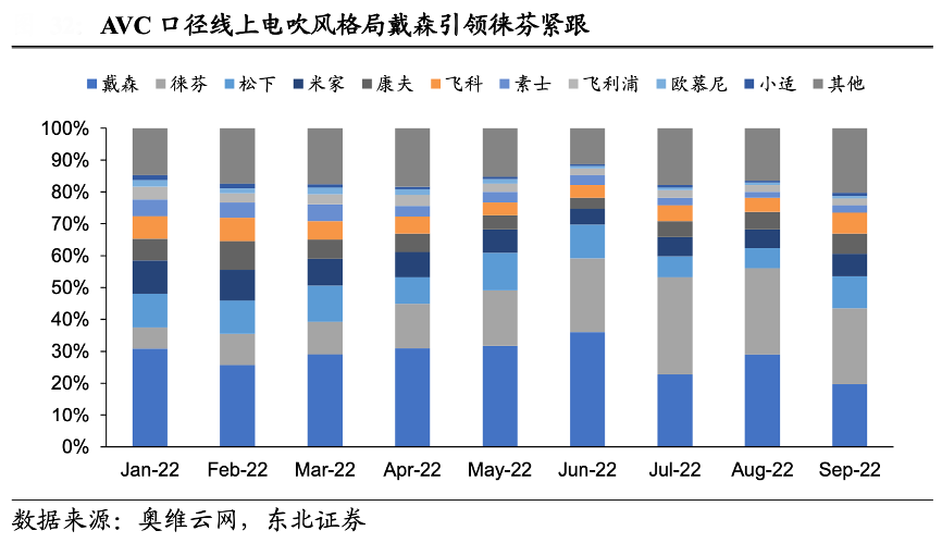 經(jīng)典創(chuàng)新案例:根據(jù)奧維云網(wǎng)、東北證券等綜合資訊表明,隨著徠芬 等新興品牌以及飛科等老國牌在高速電吹風的布局,更合適的價位段使戴森所處的高價格帶占比下降,戴森市占率隨之下滑。根據(jù)奧維云網(wǎng)數(shù)據(jù),2022 年前三季度線 上電吹風銷額 CR3 為 57.4%,其中戴森/徠芬/松下分別占比 29%/18.7%/9.7%。