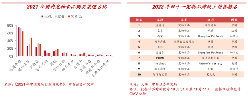 經(jīng)典案例:根據(jù)《2021年中國寵物行業(yè)白皮書》、天貓、中泰證券研究所等綜合資訊表明,伴隨電商行業(yè)的快速發(fā)展,線上渠道成為國內(nèi)寵物食品發(fā)展的重要平臺(tái),根據(jù)《2021 年中國寵物行業(yè)白皮書》,2021年寵物食品購買渠道中,電商占比超過70%,國產(chǎn)品牌相較海外企業(yè)對(duì)國內(nèi)消費(fèi)者的感知力更強(qiáng)。