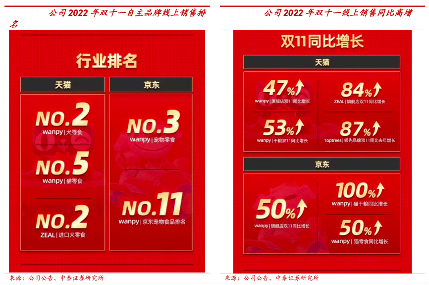 經(jīng)典案例:根據(jù)公司公告、中泰證券研究所等綜合資訊表明,中寵股份公司自上市以來先后投資領(lǐng)先寵物、華元德貝等聚焦線上的銷售公司,與阿里巴巴、京東、蘇寧易購達(dá)成戰(zhàn)略合作。2022 年雙十一,Wanpy 銷售行業(yè)排名位居寵物零食第三名;Zeal行業(yè)排名位居進(jìn)口犬零食第二名;Toptrees 領(lǐng)先品牌銷售額較去年增長 87%。