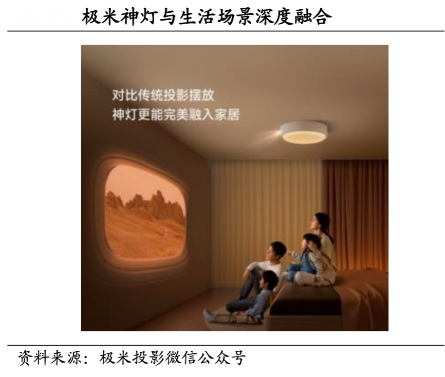 經(jīng)典案例:根據(jù)極米投影微信公眾號、國海證券研究所等綜合資訊表明,極米科技全新形態(tài)投影儀“極米神燈”2022 年 8 月進入國內(nèi)市場,集吸頂燈、 投影儀、音響于一體,配合推出無線 HDMI 同屏器,解決了傳輸不便、光線易遮 擋和射眼等問題。