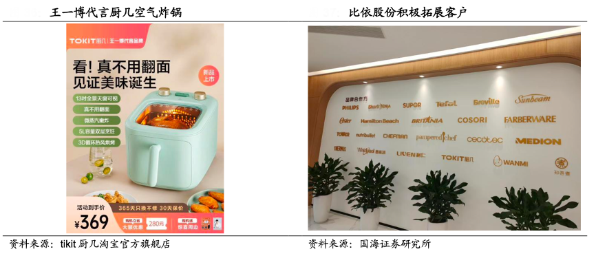 經(jīng)典案例:根據(jù)tikit廚幾淘寶官方旗艦店、國海證券研究所等綜合資訊表明,新“玩家”營銷破局,代工龍頭煥發(fā)活力。美蘇九鞏固品牌優(yōu)勢, 推出中高端、多功能新品,王一博代言廚幾強勢入局,南極人、張小泉跨界入場。同時,“空氣炸鍋第一股”比依股份積極拓展國內(nèi)外優(yōu)質(zhì)客戶資源,2022 年與國內(nèi)蘇泊爾、小熊、山本、純米,海外飛利浦、COSORI 等優(yōu)質(zhì)客戶達成新合作,主營空氣炸鍋代工享受行業(yè)發(fā)展紅利,業(yè)績彈性較大具備高增潛力。