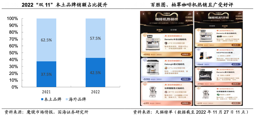 經(jīng)典案例:根據(jù)魔鏡市場(chǎng)情報(bào)、天貓榜單、國(guó)海證券研究所等綜合資訊表明,從我國(guó)咖啡機(jī)銷售表現(xiàn)來(lái)看,德龍、奈斯派索、飛利浦等中高端海外品牌占據(jù)市場(chǎng)主流,百勝圖、柏翠等高性價(jià)比的本土品牌增 長(zhǎng)亮眼,百勝圖咖啡機(jī) 2022M6 銷額 2479 萬(wàn)元(同比+605%),“雙 11”銷額 3584 萬(wàn)元達(dá)到 top2;柏翠咖啡機(jī) 2022M6 銷額 1226 萬(wàn)元(同比+505%),“雙 11”銷額 1569 萬(wàn)元位居 top6。