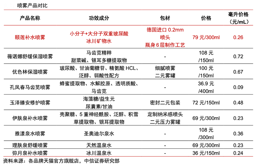 經(jīng)典案例:根據(jù)各品牌天貓官方旗艦店、中信證券研究部等綜合資訊表明,頤蓮補(bǔ)水噴霧貢獻(xiàn)品牌大比例營收,在全網(wǎng)噴霧銷售排名前列,也塑造了頤蓮在性價(jià)比、保濕方面的品牌形象。從性價(jià)比出發(fā),頤蓮噴霧價(jià)格僅略高于“白牌”功效噴霧和理膚泉純水噴霧,低于雅漾純水噴霧及其他功效噴霧,性價(jià)比優(yōu)勢明顯。