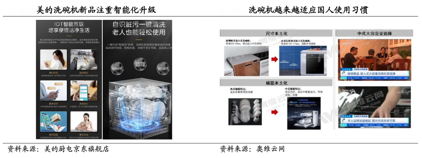 經(jīng)典案例:根據(jù)美的廚電京東旗艦店、奧維云網(wǎng)、國海證券研究所等綜合資訊表明,綠色智能升級,洗碗機(jī)規(guī)模逆勢增長。1)產(chǎn)品趨勢:2022年綠色消費(fèi)政策推動下,洗碗機(jī)向節(jié)能化方向升級,功能則向集成化、智能化、本土化方向發(fā)展。 2)市場規(guī)模:據(jù)奧維數(shù)據(jù),2022H1 洗碗機(jī)零售額 51.5 億元(同比+11.4%),“雙十一”期間零售量/額分別為 27.9 萬臺/13.0 億元,分別同比+5.9%/+17.1%,