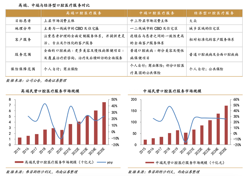 經(jīng)典案例:根據(jù)公司公告、弗若斯特沙利文、西南證券等綜合資訊表明,高端口腔醫(yī)療服務(wù)以更高的醫(yī)療標(biāo)準(zhǔn)與更佳的服務(wù)設(shè)施與私密度滿足成熟消費(fèi)者的期望。中端口腔醫(yī)療服務(wù)提供商通常以連鎖店的形式提供服務(wù),能夠搭建全面 客戶服務(wù)體系。高端民營(yíng)口腔醫(yī)療服務(wù)市場(chǎng)在 2012 年為 12.9 億元,根據(jù) 沙利文預(yù)測(cè),將于 2025 年達(dá)到 74.9 億元,CAGR 達(dá) 14.5%。