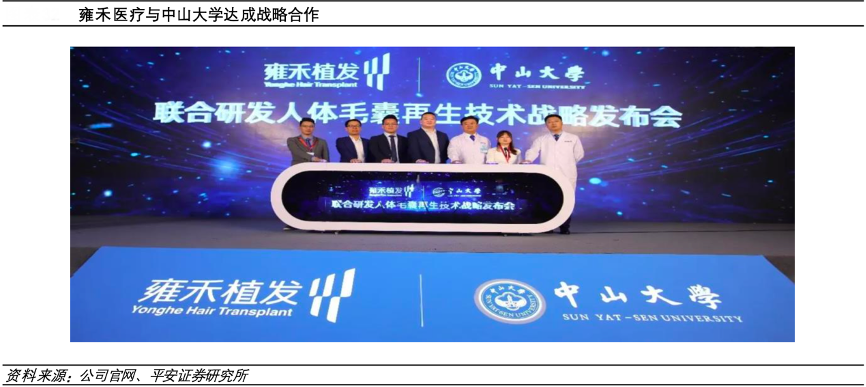 經(jīng)典案例:根據(jù)公司官網(wǎng)、平安證券研究所等綜合資訊表明,雍禾醫(yī)療與中山大學(xué)達(dá)成戰(zhàn)略合作,研究異體毛囊移植免疫排斥解決方案、新型預(yù)防焦慮誘導(dǎo)脫髮的小分子藥物開發(fā)、多功能型植髮手術(shù)床、溫和型泡沫洗髮水等,并初步取得成果。2021年,公司與四川大學(xué)華西醫(yī)院合作雄脫治療新靶點(diǎn)項(xiàng)目,進(jìn)一步在防脫植發(fā)領(lǐng)域深耕。