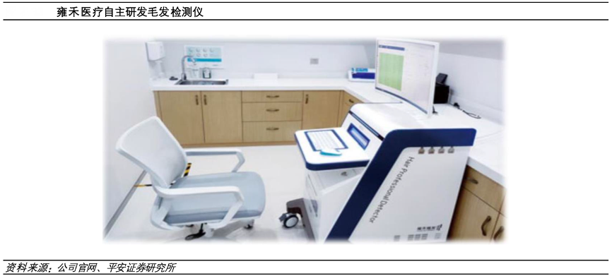 經(jīng)典案例:根據(jù)公司官網(wǎng)、平安證券研究所等綜合資訊表明,雍禾醫(yī)療公司自主研發(fā)了毛發(fā)檢測(cè)儀,可以精確測(cè)量毛發(fā)的長(zhǎng)度和直徑,準(zhǔn)確分析脫發(fā)程度,并 協(xié)助醫(yī)生制定診斷治療方案,通過智能圖像識(shí)別及大數(shù)據(jù)演算以提升患者就診體驗(yàn)。公司攻關(guān)研發(fā)專業(yè)植發(fā)多功能手術(shù)床, 自主設(shè)計(jì)研發(fā)手術(shù)醫(yī)療輔助器械,同時(shí)還采用了PK7000 毛囊提取儀、SKIN 管理儀、光動(dòng)力儀等。