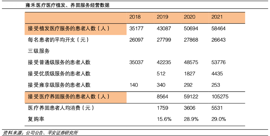 經(jīng)典案例:根據(jù)公司公告、平安證券研究所等綜合資訊表明,通過全產(chǎn)業(yè)鏈的服務(wù)體系以及醫(yī)護人員服務(wù)能力的提升,雍禾醫(yī)療的患者人數(shù)不斷增加。接受植發(fā)醫(yī)療服務(wù)的患者人數(shù)從 2018 年 35177 人增長至 2021 年 58464 人,3 年的復合增長率為 18.45%;接受醫(yī)療養(yǎng)固服務(wù)的患者人數(shù)從 2019 年的 8564 人增長至 2021 年的 105275 人,復合增速達到 250.61%。