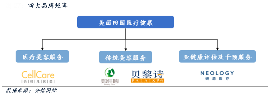 經(jīng)典案例:根據(jù)安信國際等綜合資訊表明,美麗田園經(jīng)過 30 年沉淀,打造了多品牌組合,提供多元化服務(wù)涵蓋傳統(tǒng)美容服務(wù)需求(品牌:美麗田園、貝黎詩)、醫(yī)療美容服務(wù)需求(品牌:秀可兒)和亞健康評(píng)估及干預(yù)服務(wù)需求(品牌:研源)。